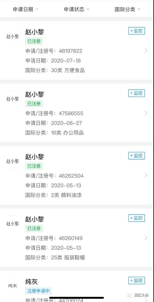 如图,这些商标分类如此之多,涉及领域如此之广,让我们不难看出赵小黎背后,是有着更大的变现野心的。