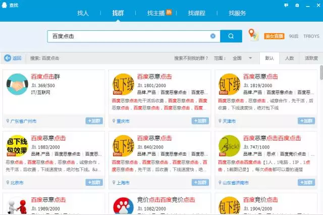 这类群有两种恶意点击模式。一种是通过付费给群主,群主利用VPN、软件或者通过黑客手段控制肉鸡电脑来进行点击;另一种是在群里“一呼百应”,喊一句“兄弟们帮我点一下XX关键词XX公司的广告多谢”,然后就有众多小伙伴揭竿而起拼命帮你点。