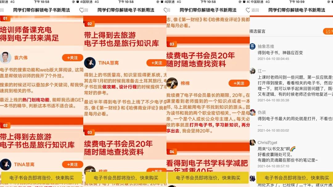 得到本次电子书会员销售,把电商多年的产品详情页浓缩成了精华,用消费者视角去描述产品用途,而更多使用指南,也以留言的形式呈现出来,极大的加强了消费者信任感,而且丰富了产品的使用场景。