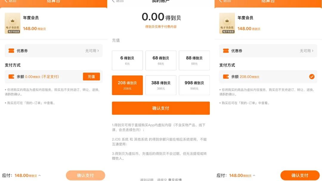 而且无法使用第三方支付工具,只能往里充值规定金额的得到贝,且多充值的得到贝无法提现,只能消费;