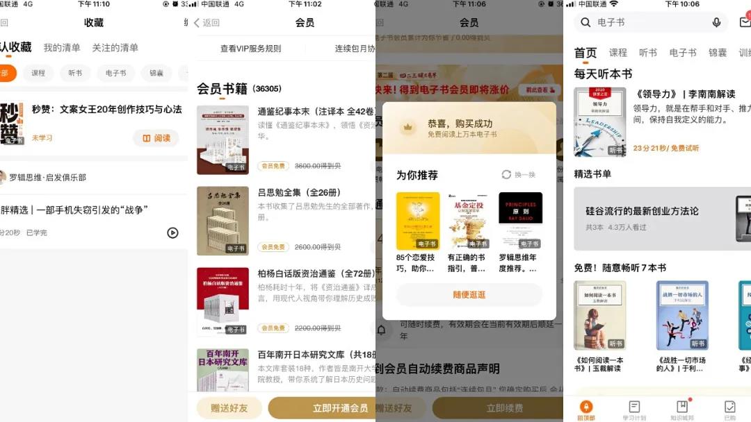 得到业务板块,最早推出的便是听书,大基数的用户的有消费或使用过听书的;而这一捆绑销售行为,可以有效的提高销售额,让已经是目标用户的人群可以有更多元的选择,在消费者心理上会有买听书会员≈送电子书会员的获利感。