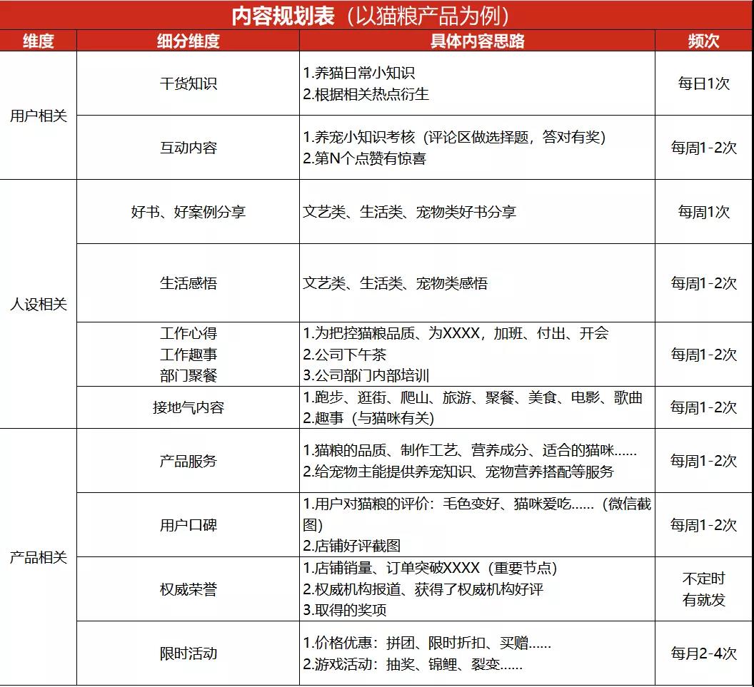 在制定 SOP 之前,需要先制定内容规划表。围绕业务、产品、人设,确定朋友圈可以发的内容维度、具体内容思路、频次。