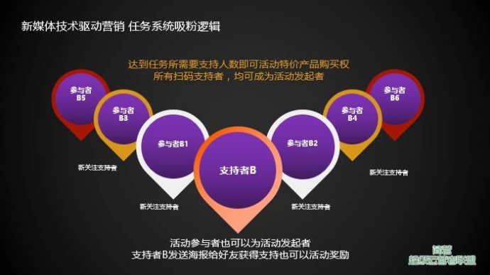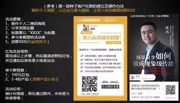 确定选品诱饵,制定可裂变游戏规则,带动企业种子用户(社群相关),参与活动当中,一人参与带动多人完成相关任务,从而在朋友圈/微信群发生裂变化学反应,带动更多新用户关注参与,增加粉丝关注量,并且通过产品购买完成最终一环,筛选粉丝精准度,成为平台终身客户。