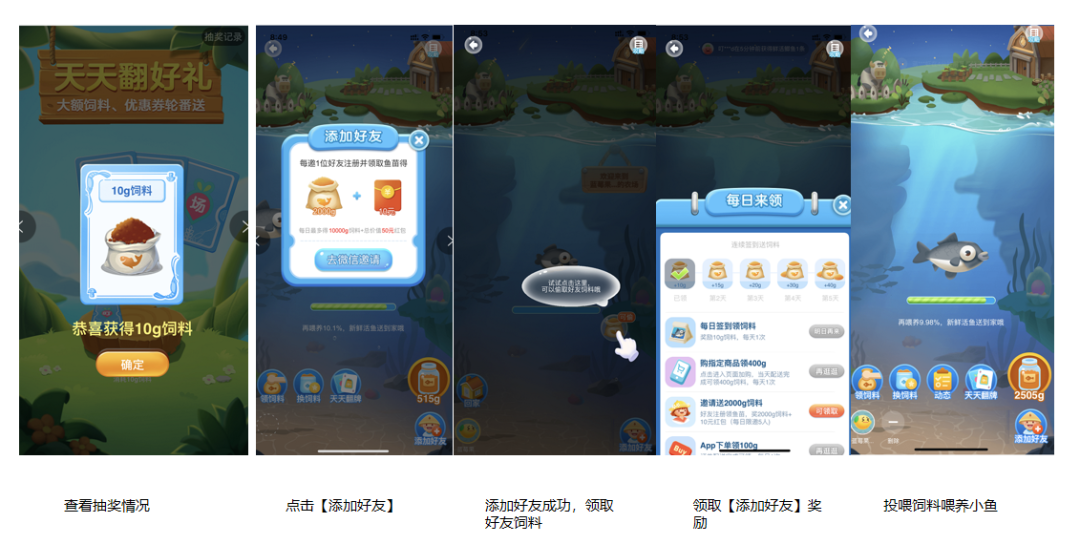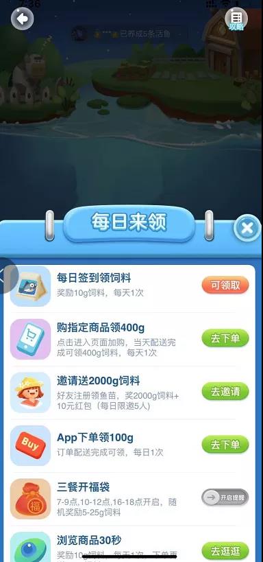 养成式小游戏,通过养鱼苗到成熟的鱼,可以得到活鱼奖励,刺激用户积极参与
