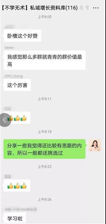 真正好的私域社群,往往都是用户自己能社交链接产生话题,同时也能够让群主有人设和IP的。比如我的不学无术私域增长资料库,我是群主IP,但群里不需要管理也会自己产生很多话题,我不说话的情况下,大家也会就某些话题进行交互和讨论。这才是一个高质量的社群,才是一个大家共创的社交社群。