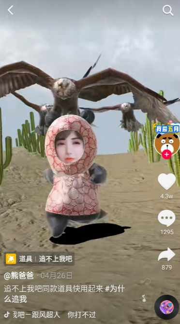老鹰在追下面这个(什么动物我也看不懂),你拍我拍他也拍,全部都是一样的,表情都差不了多少,类似的这些道具特效,平台大大方方的给你一个“拍同款”的按钮。