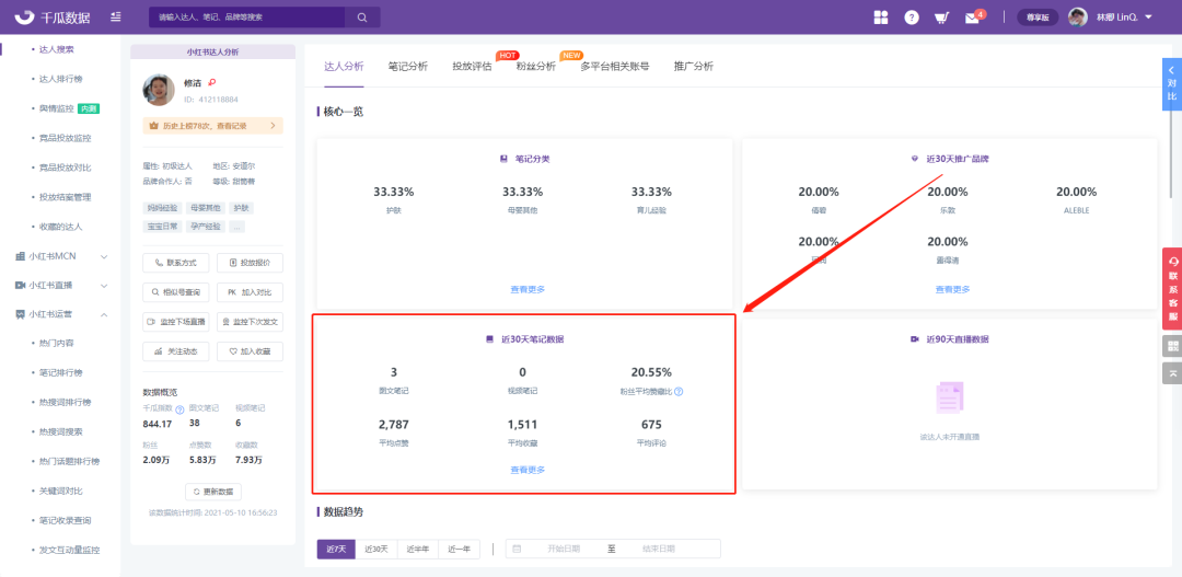 11、点击"笔记分析页",查看近期笔记实际数据;