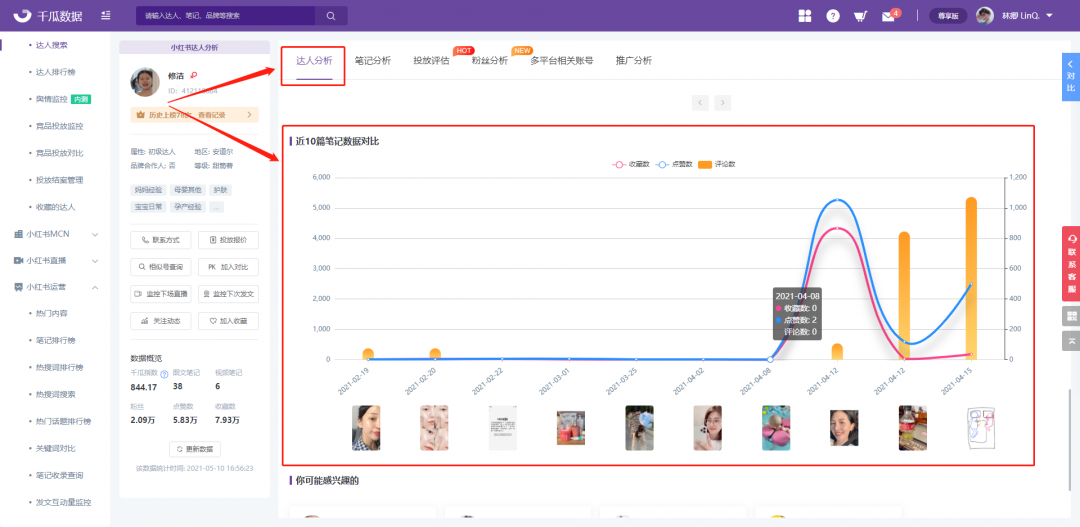 10、下滑至"达人分析页"底部,查看"近10篇笔记数据对比";