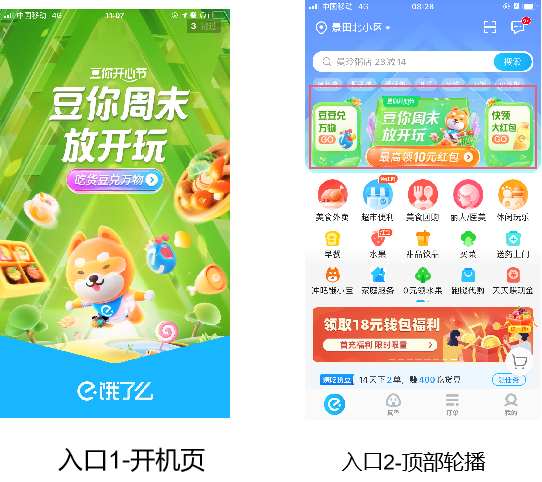 活动宣传位:用户打开APP开机页就会有活动宣传,首页入口位置在顶部轮播,且采用设计使用动态,吸引用户注意力。