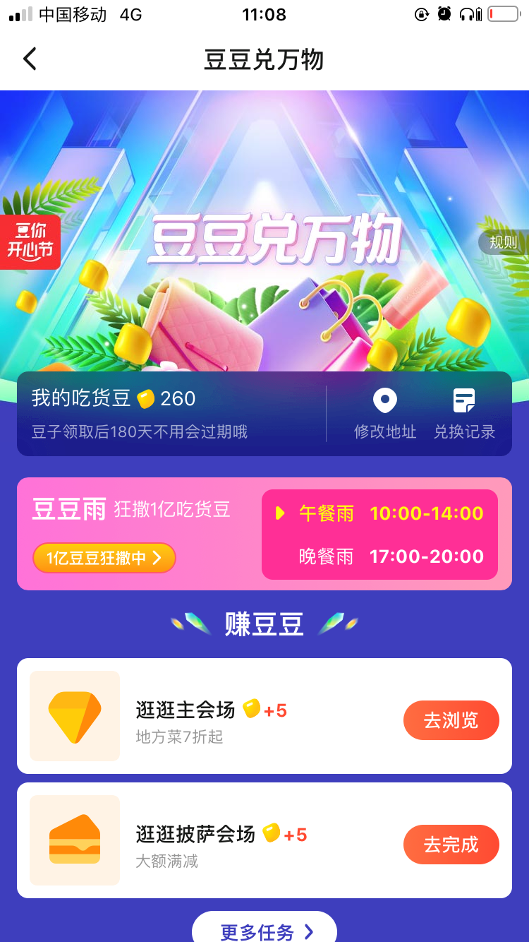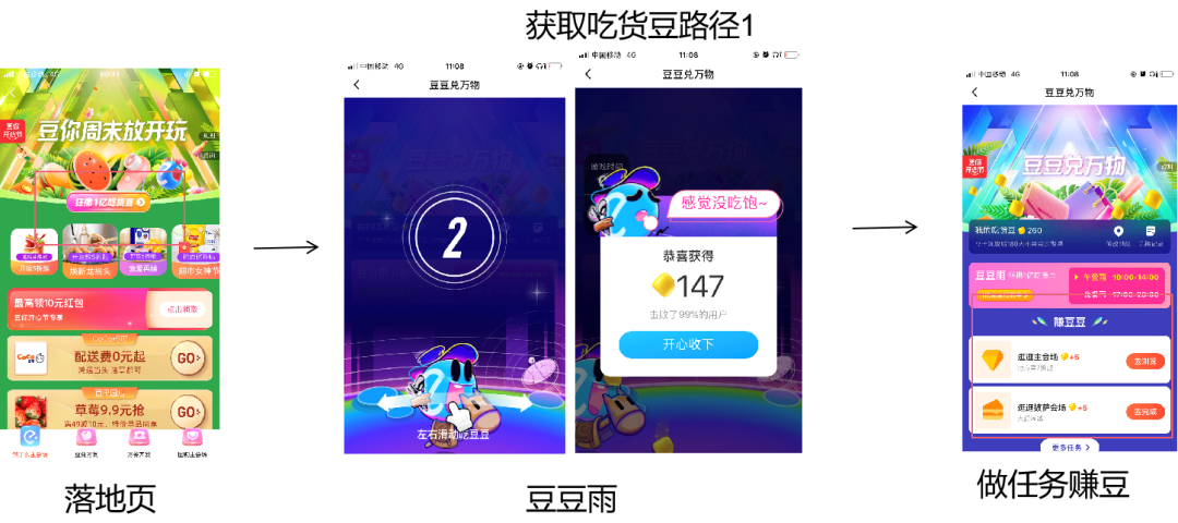 1.通过低门槛游戏化玩法-豆豆雨获得吃货豆,游戏过程很快并且操作简单,让用户体验到快感