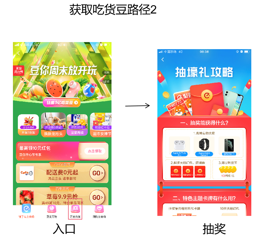 盒马小镇的玩法是花盒花还能赚一定盒花,有利于保持用户活动,而饿了么这次活动,没有形成闭环,花吃货豆只有出口,不利于后续转化