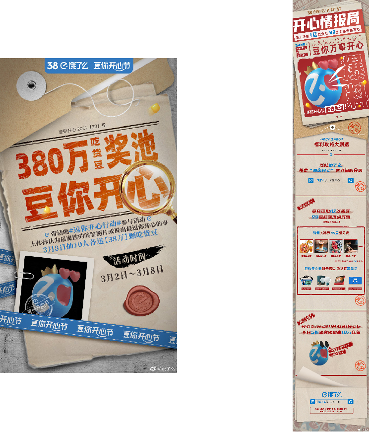 外部渠道触发:饿了么在微博上发起了#38饿了么豆你开心节#的话题,阅读2.3亿 讨论条数超过100万,从数据上可看冷启动时期已经受到广泛关注。