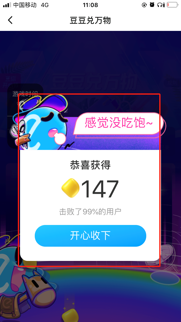 这里比较有意思的是,游戏后有这样一段话:感觉还没吃饱,给了用户心理暗示,还不够,还得继续赚豆,从而增加用户在APP的停留和用户粘性。