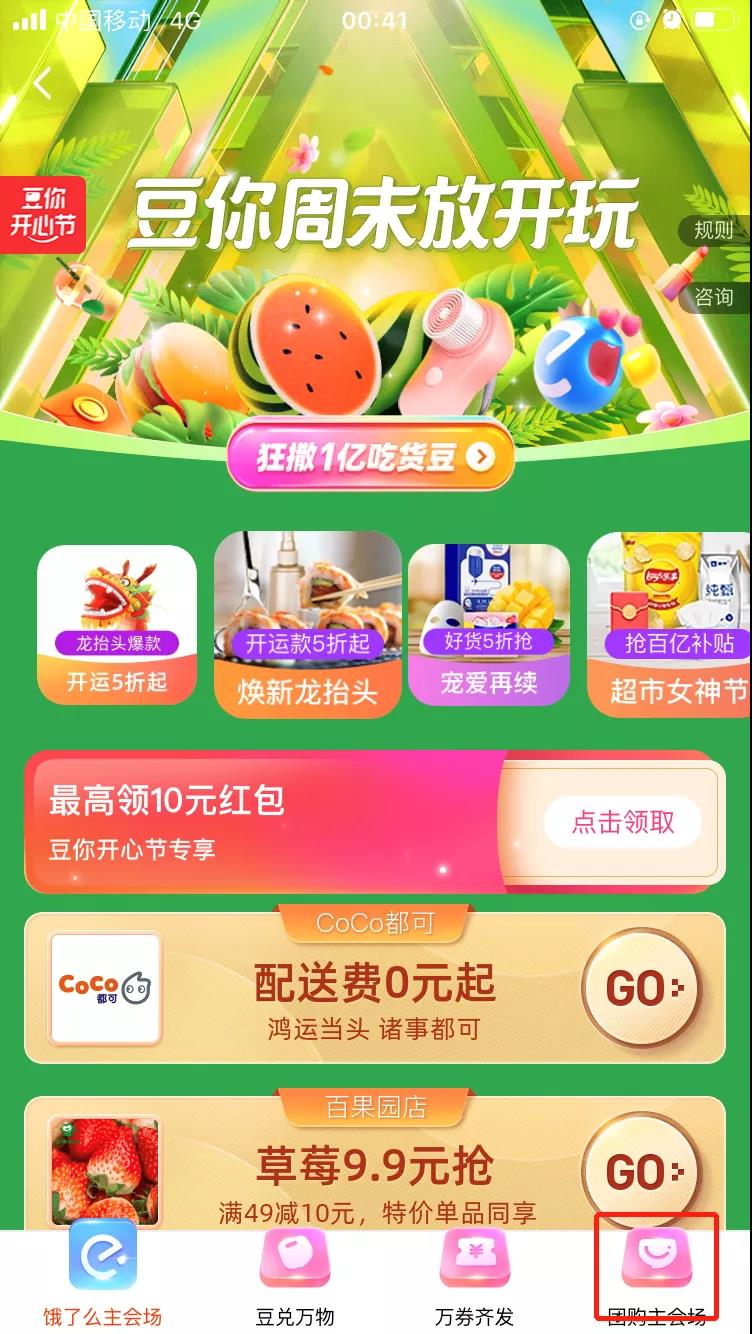 在团购主会场(口碑专场)中点击饿了么外卖会场,直接弹活到活动首页,没懂这个设置的意图,另外团购主会场出现与吃货豆有关系活动,纯粹提供了口碑的展示页,为口碑商家赋能。