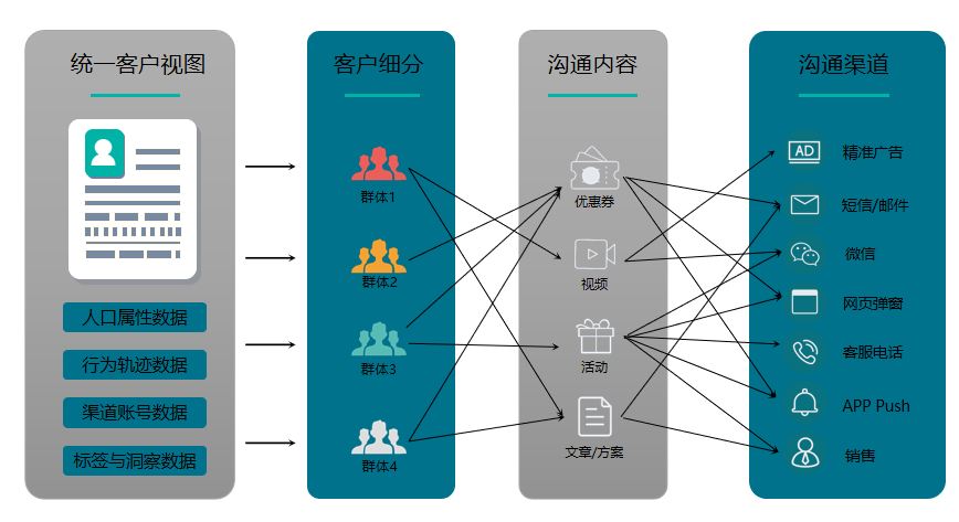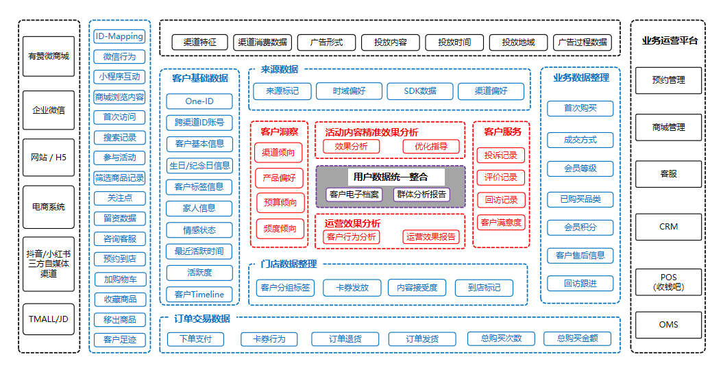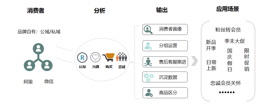 用户从不同渠道进入以后通过订单的购买行为,CDP通过分析用户的认知,兴趣,购买,忠诚输出用户的画像;同理也需要我们在运营过程中梳理清晰流程SOP和参照的数据字段维度,最终对应不同的应用场景
