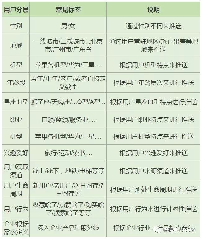 用户分层是为了更好地完成标签推送,如新用户和老用户,推送的信息完全是不同的,北京地区的用户和四五线小城市的用户,推送的信息也不同。我们通过不断给用户打标签来完成特定或信息推送。