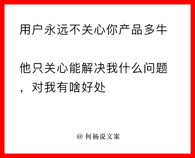 总之一句话,你产品牛不牛,跟用户没关系,你得说用户真正关心的。用户关心什么呢,就是他自己的利益,明白了吗?