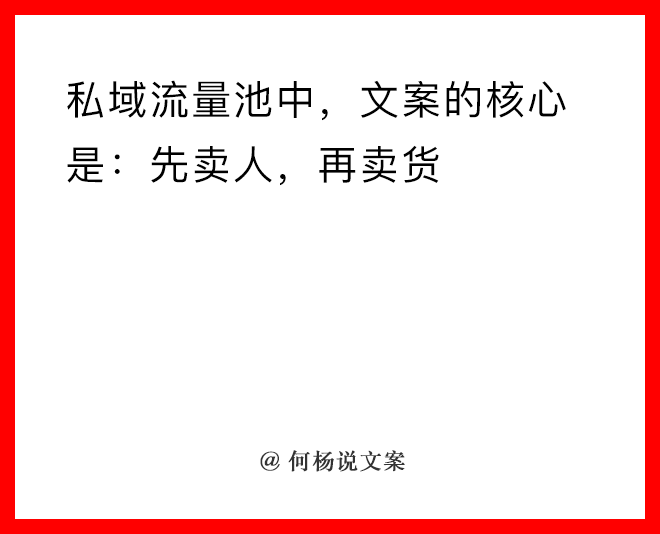 那我们在经营私域流量的时候,写文案的目的,一定先卖人、后卖货,也就是你要打造属于自己的个人品牌!比如朋友圈文案,你就要通过文案,首先让别人相信你这个人,对你这个人产生信任感之后,他才会跟你买东西。