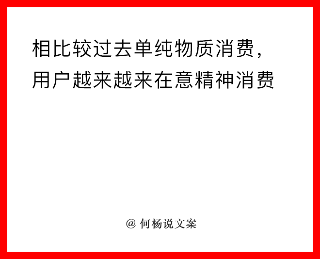 在以前物质匮乏的时代,人们买东西更多是为了解决温饱。但是现在生活水平提高了,产品也越来越多,相比较原先单纯的物质消费,人们越来越在意精神层面的消费。所以,高手写文案的时候,尤其是同质化严重的产品,他们会越来越关注用户精神层面的需求!
