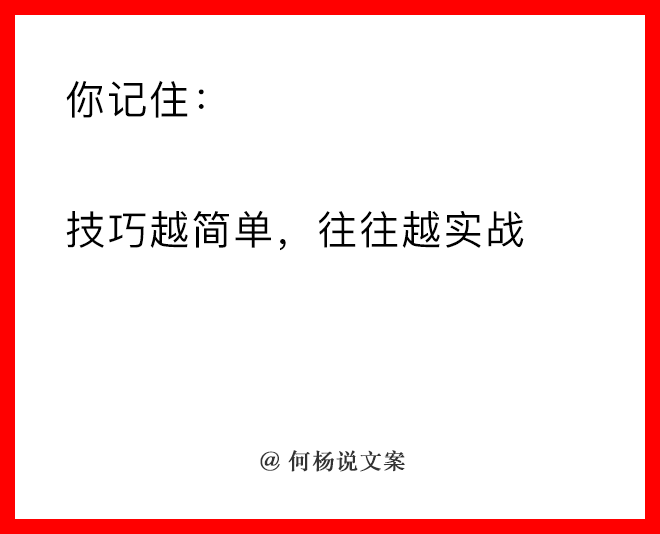 其实文案也是一样的,所有的文案技巧,都是越简单、往往越实战。但是现实是,很多人不重视,非去浪费时间,金钱追逐那些看似高大上、却花里胡哨的技巧。