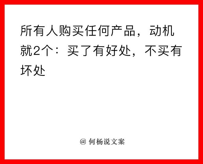 文案中也一样,你想要用户产生购买欲望,也有两种方法,一种就是告诉他,不用产品会痛苦,第二种是,用了产品有好处。记住,所有销售文案,我们在刺激用户购买动机的时候,就考虑这2点就够了,是不是非常清晰?