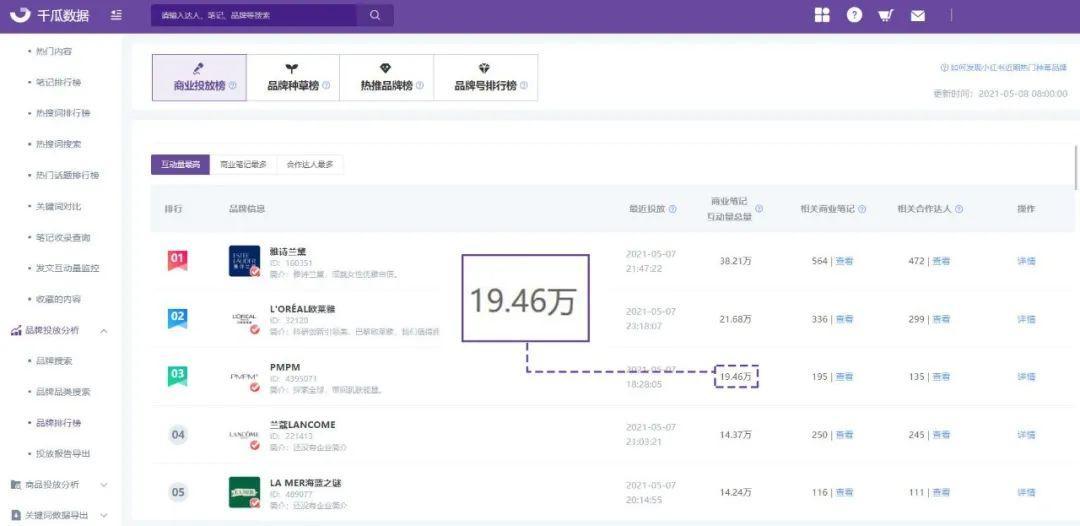 国产护肤品牌PMPM是蓄水期小红书品牌投放的一匹黑马,千瓜数据显示,四月小红书护肤品牌商业投放榜互动量最高中,PMPM排行第三,商业笔记互动总量19.46万,超兰蔻、海蓝之谜等一众大牌。