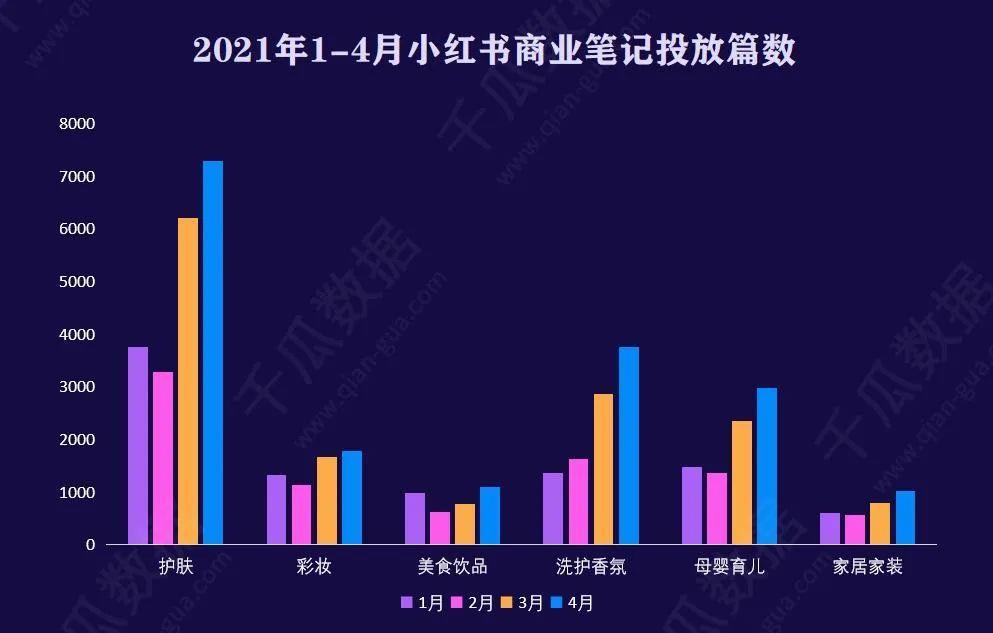 从千瓜数据统计的2021年1-4月小红书商业笔记投放篇数可见,对比一二月份,三四月份小红书护肤、彩妆等行业大盘有了明显的增长。三八妇女节和年后复工消费是三月份品牌商业笔记倍速增长的主要原因,四月则是为五一、母亲节、5.20和6.18活动蓄水。
