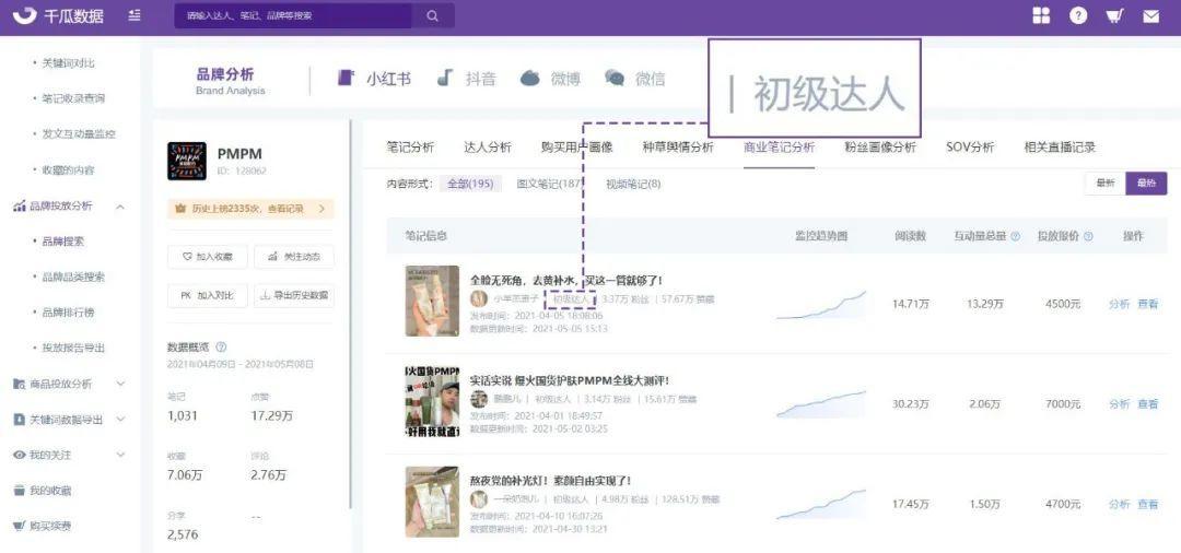 查看品牌135位相关合作达人,除一位头部达人外,其余均是腰初部达人,品牌商业笔记分析显示,初级达人“小羊羔崽子”发布的合作笔记排行第一,互动总量高达13.29万,为PMPM提供了超高的投放互动转化。