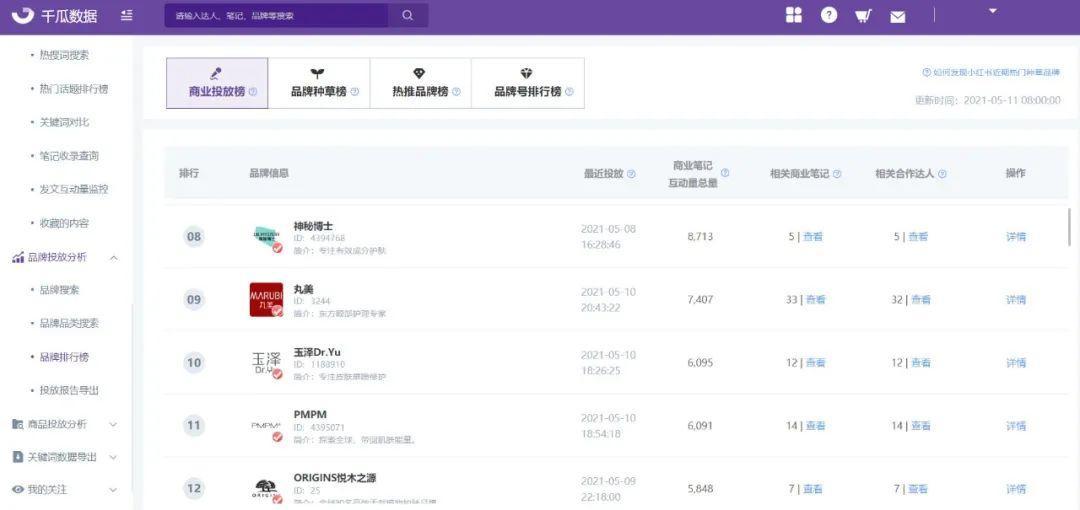 千瓜数据显示,5月第一周6.18冲刺期开始,神秘博士、丸美、玉泽和PMPM等众多国货品牌便登上了小红书商业投放互动量榜,今年6.18国货品牌的表现力最终如何,值得期待。