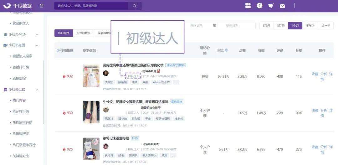 头部达人粉丝多、受众广,腰初部达人的粉丝粘性高、种草力更强,在千瓜数据中搜索查看近一个月小红书商业笔记排行,前三名创作者均为初级达人。