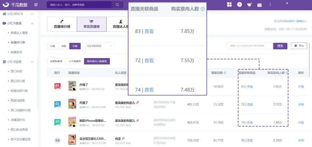 千瓜数据显示,小红书达人“爱臭美的狗甜儿”四月做的三场直播霸占了小红书四月直播带货榜前三,累积购买意向人数超二十万,直播间关联商品超200个,帮助众多品牌在蓄水期间实现曝光和转化。