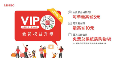 打造“名创周三会员日”:打造专属于名创会员的狂欢购物节,不同会员级别,周周可享全场满68元-10/8/6元。