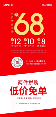 比如门店每周三的名创会员日,金卡会员享受的是全场满68元-10元优惠,银卡会员享受的是全场满68元-8元优惠,普卡会员享受的全场满68元-6元优惠。