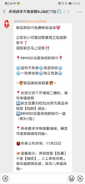 “名创剁手不败家群””有很多干货内容分享,比如MINISO早安速报、还会有新品发布,直播种草和新品体验官招募来吸引用户的注意力。