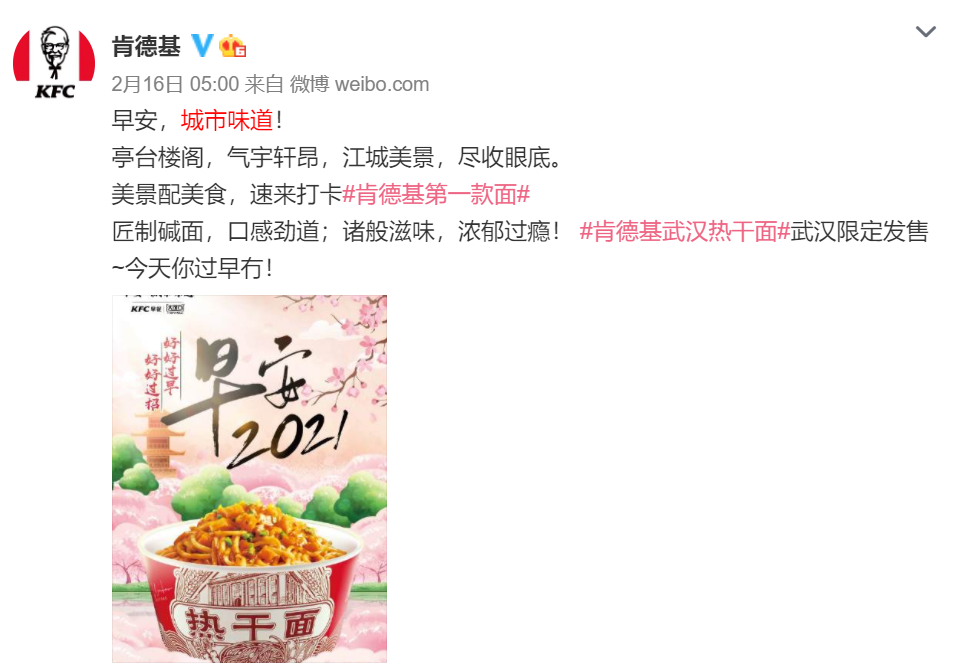 今年年初,在肯德基就推出了「早安·城市味道」之武汉篇,在品牌推出的#肯德基第一款面#——#肯德基武汉热干面#全新上市之后,就获得了不少武汉的网友争先到门店打卡,更是让不少关注肯德基品牌的用户羡慕,以此在潜移默化中帮助品牌实现了营销的转化。