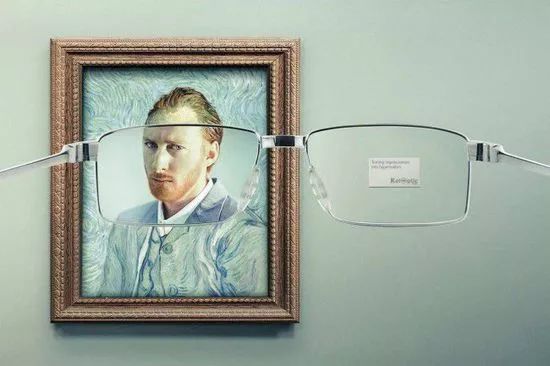 巴黎扬罗必凯为法国眼镜品牌Keloptic做广告时,以梵高自画像、巴黎圣母院等印象派画为背景,制作了一系列对比广告,不断强化眼镜清晰度这个卖点: