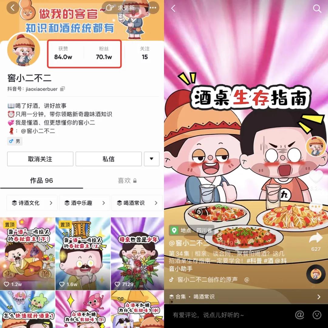 比如抖音号@窖小二不二,以呆萌的动漫IP"窖小二"为主角,向大家讲述酒文化和知识。在迎合新一代的同时,不失品牌核心价值,讲好中国白酒故事。该号不到1年斩获68.5万粉丝,最高1条作品获3.7万点赞。