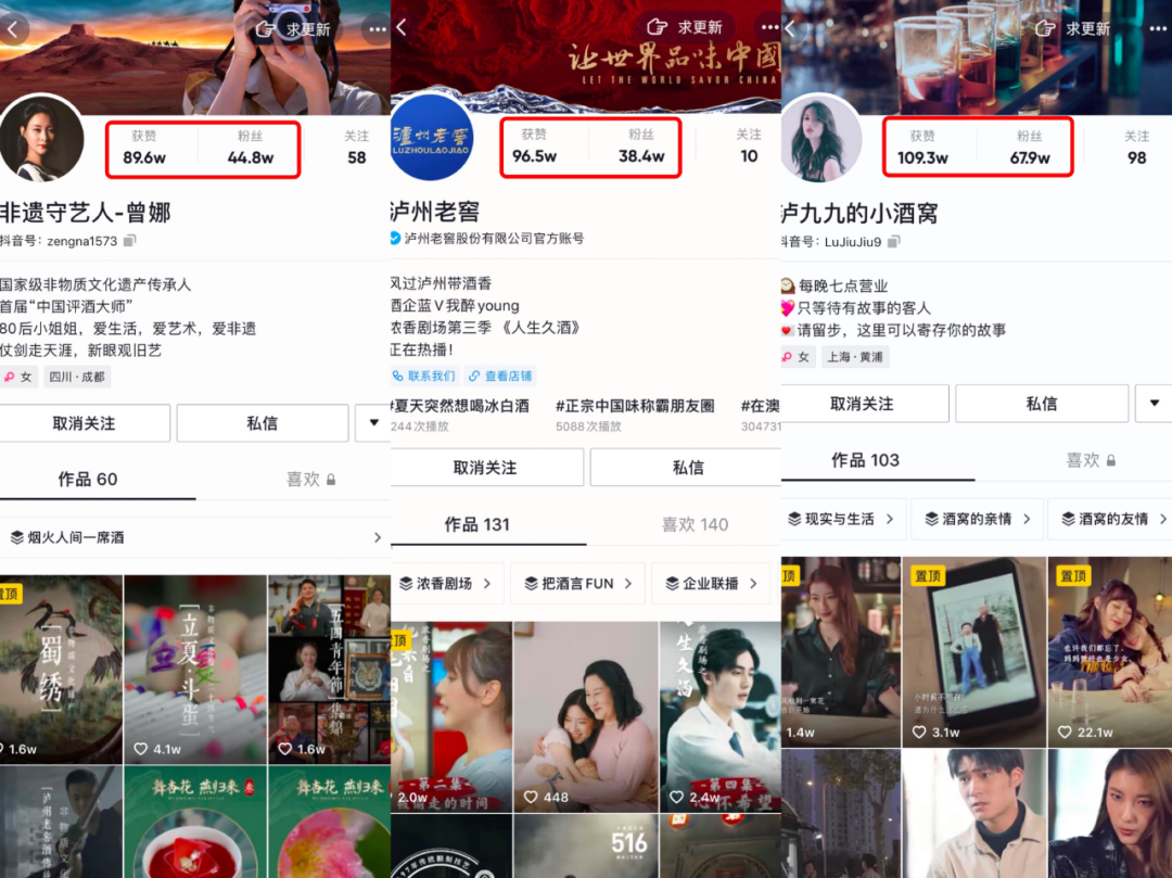 在抖音上,泸州老窖开设10余个账号,通过不同人设和优质内容打造,跟大众强互动。