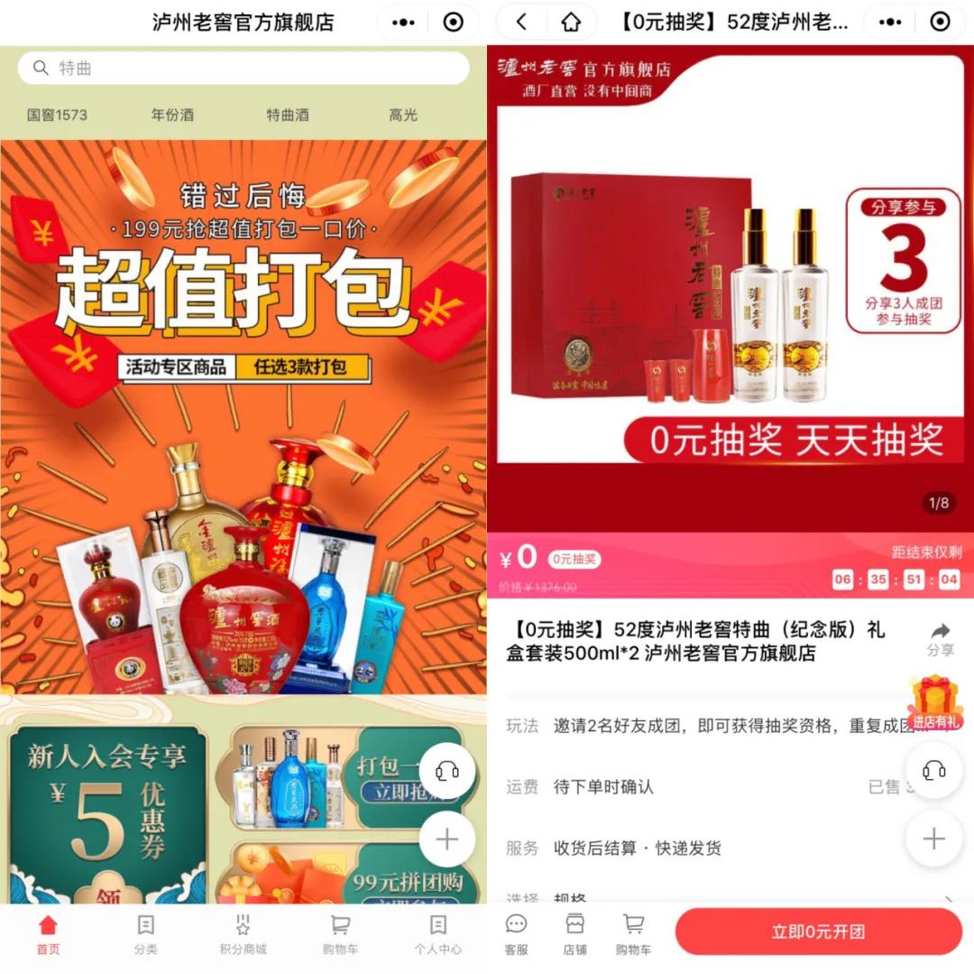 针对传统拼团活动出现疲软的情况,泸州老窖探索出了"0元抽奖团"裂变新玩法。消费者只要拼团成功,即可获得抽奖资格(奖品中有极具吸引力的国窖1573)。