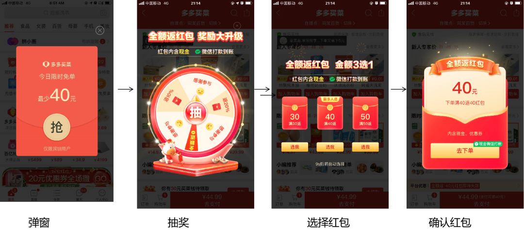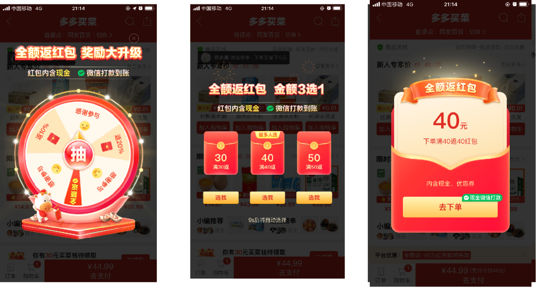 进入多多买菜活动页,进行抽奖,迭代后,这一块多多从2次抽奖变成了1次,以前版本是第一次不成功,额外一次机会就成功全额返,而这次是抽一次,个人认为以前版本更能让用户感到厌恶损失,而转盘还是老玩法,慢慢转到满额返,调动起用户情绪,而有意思的是现返红包金额让用户自主选择,这里用户开始有价格锚定,我打算要在这买多少钱,买什么,这里诱饵效应+厌恶损失的效应开始起效,用户做出了努力,不达到目标就会不甘心