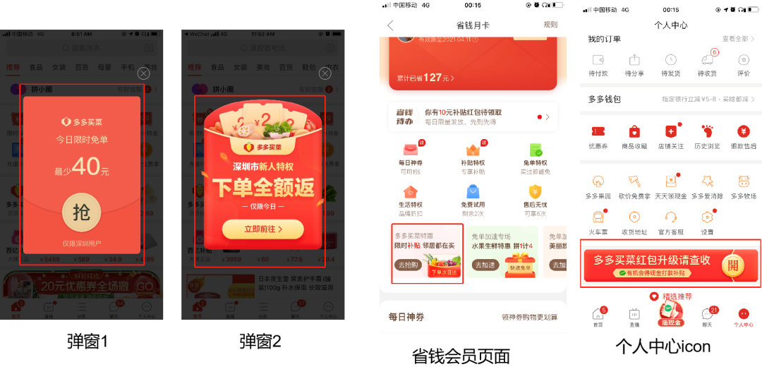 活动有三个入口分别是弹窗、个人中心腰封轮播、省钱卡会员领券中心的icon,分别都是流量大的位置,个人认为资源位选取的考量分别是:弹窗-流量大入口,个人中心-查看物流动态等用途,使用频率高,且处于视觉中心位,曝光率得到提升,省钱卡会员- 精准客户投放,买省钱卡一般是自认为"精打细算"的用户,所以这羊毛不薅觉得都亏了几个亿了。