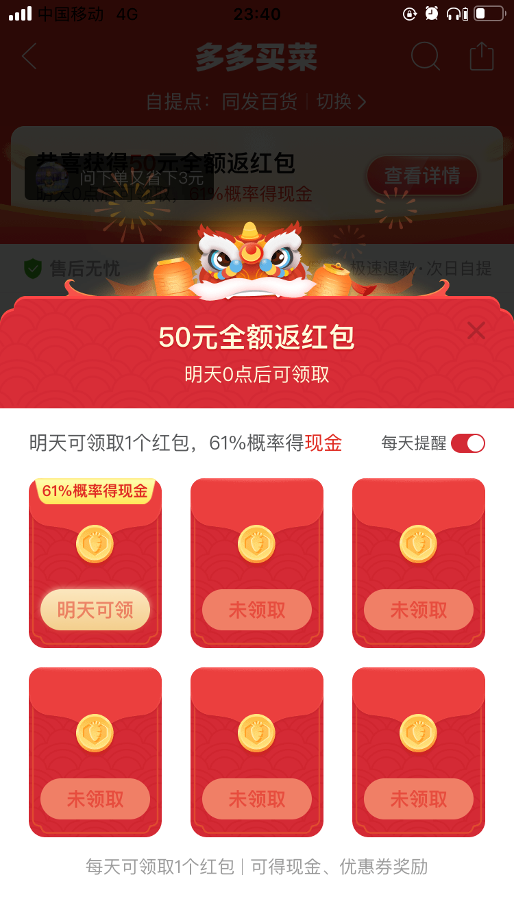 用户下单成功后,pdd立马给讲解红包获得的规则,带有未知的玩法,让用户产生再次产生兴趣,还会特意定了提醒(这一步让用户开了push),有利于后面营销转化,由于我第一天参加还不知道现金返现会多少,从获客成本上计算,个人认为不会超过5元。