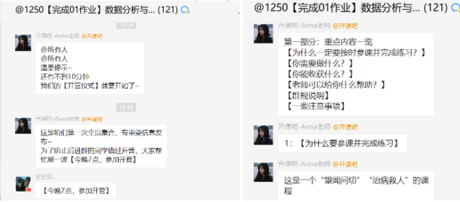 3、开营仪式部分没有讲作业提交方式,后面有人问了才有老师在群里回答;在开营仪式中没有自我介绍环节,一般自我介绍可以很好的带动社群氛围,为社群破冰。