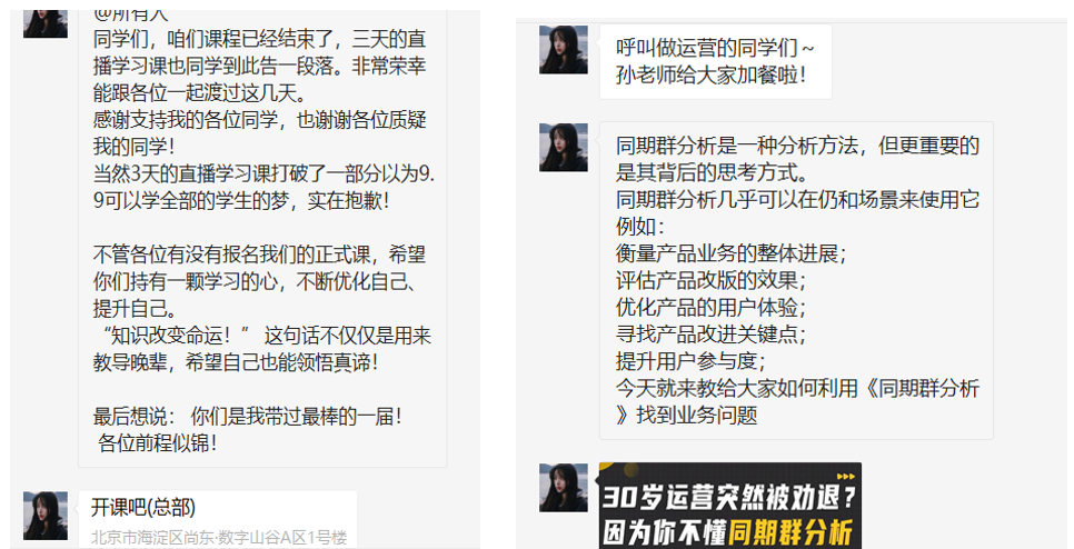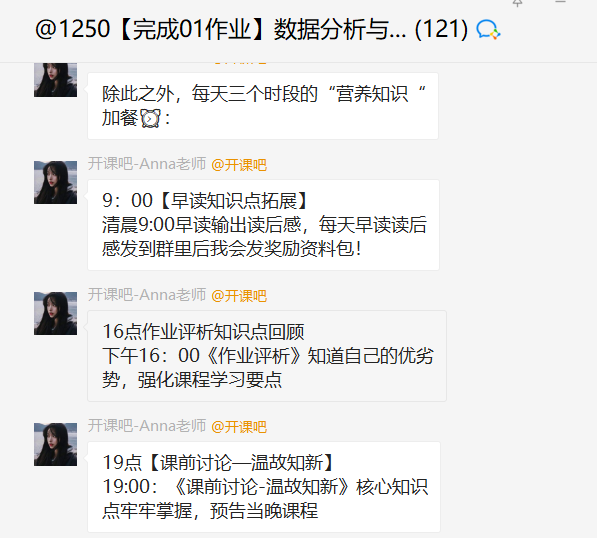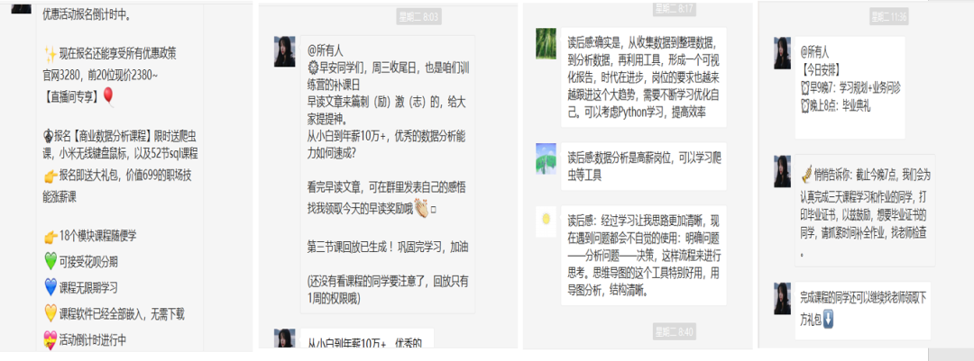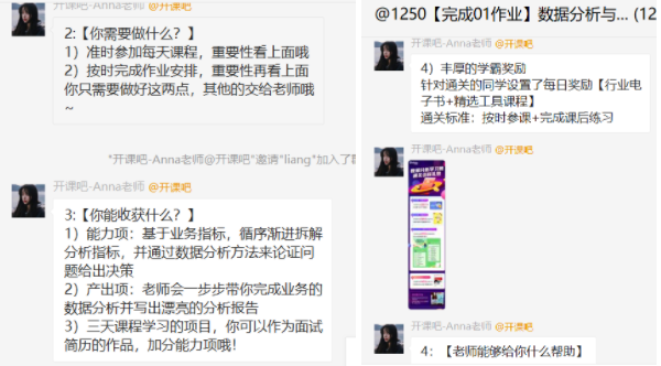 前三天为直播课+作业+老师点评,后两天会在群里发一些数据分析课程的资料(根据低价课的套路,后两天应该会在群里有转化的动作)