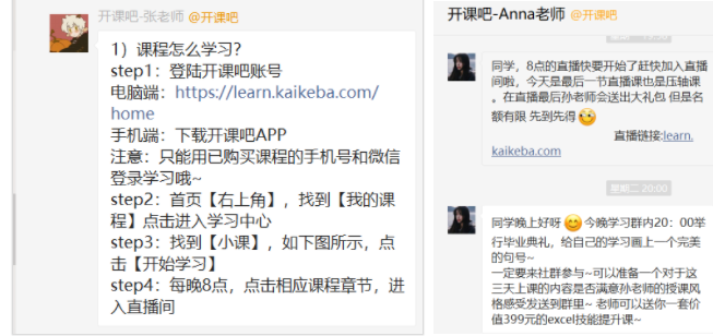 2、开课时会有短信提醒看课,并有老师在群里告知并私聊,告知开课时间很准时,八点准时发送本次直播课程的亮点。
