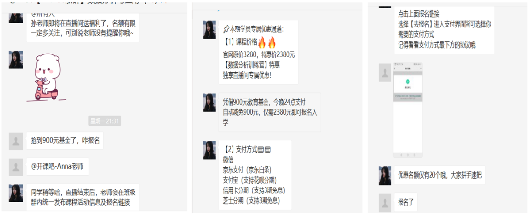 1、最后一天(12号)直播课程老师在直播间发送正式课程优惠券,告知报名课程还有可领取福利大礼包。水军话术+晒单+往期学员好评截图。