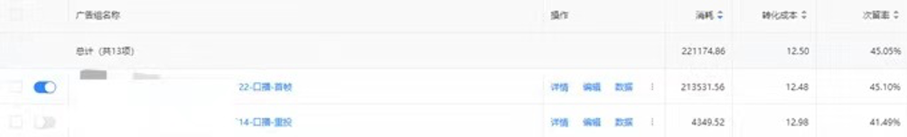 下面一条是重投跑量素材的广告组,另一条则是加首帧后的跑量素材的广告组;两周消耗量级相差了20w,且加了首帧的跑量素材次留率达45.1%;生命周期长达1个月左右;