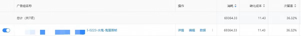 除了口播之外,同时我还测试了内容类的视频,这个视频我重投了很多次也投了好几个账户,一直跑不起来,然后加一个首帧继续投,没想到1天花了7万左右,虽然次留率偏低,但好在其他素材拉了一下次留,账户次留率也能达标。