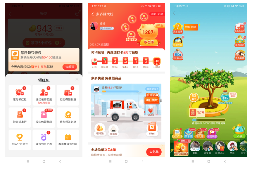 签到、多多果园和多多赚大钱,则是承接裂变进来的流量的关键。签到可得签到豆,签到豆可直接提现,1元=100签到豆;多多果园则是完成指定的动作获得水滴和肥料,将树种好之后可以一箱水果邮递到家,实现水果自由;多多赚大钱则是完成指定动作获取金币,金币可兑换商品的模式,同时在这个页面有很多的免单刺激,刺激用户进行购买。