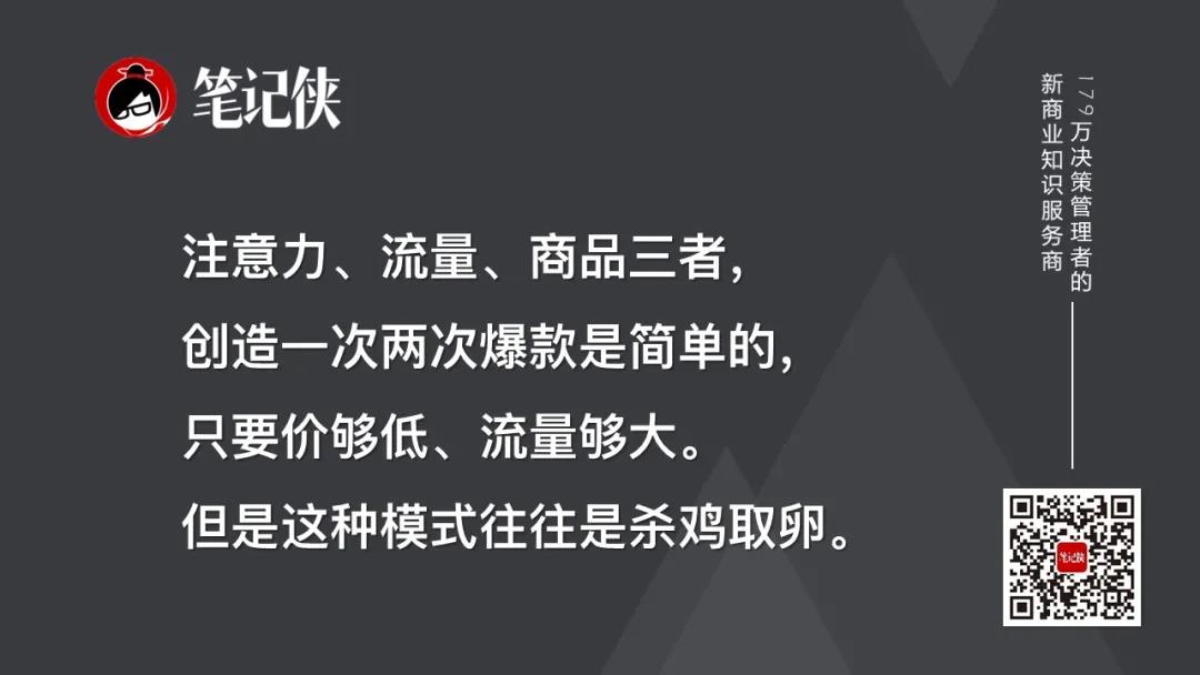 注意力、流量、商品三者,创造一次两次爆款是简单的,只要价够低、流量够大。但是这种模式往往是杀鸡取卵。